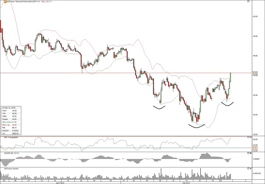 Absolut eindrucksvoll und in Anbetracht meiner Aufstellung auch begeisternd, ist das was aktuell rund um die Goldminen passiert. Gold (XAUUSD) hatte heute offensichtlich beschlossen die Tiefs noch einmal zu testen, eine Variante, die ich hier ja schon antizipiert hatte. Das hielt den Goldminen ETF (GDX) aber nicht davon ab, nach anfänglicher Schwäche und trotz dickem Minus im Gold wieder ins Plus zu drehen. Und dann, im späten Handel, macht es noch einmal *BAMM* und der GDX sprang über die 44 USD und schloss mit 4% im Plus ! Und das trotz schwachem Goldpreis und schwachem Aktienmarkt, deutlicher kann man nicht zeigen, dass man nun nach oben will.